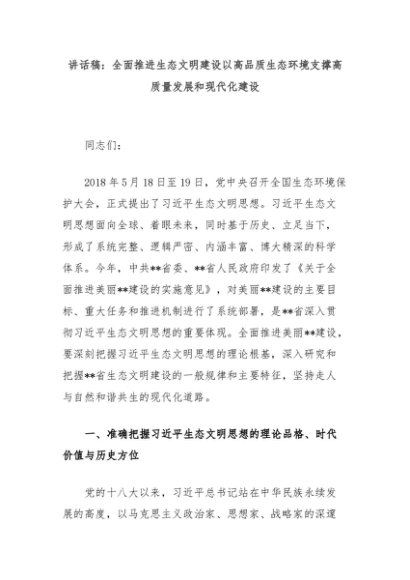 【七哥公文】2024年:讲话稿:全面推进生态文明建设以高品质生态环境支撑高质量发展和现代化建设+更多免费公文+VX:QiGeGongWen2024
