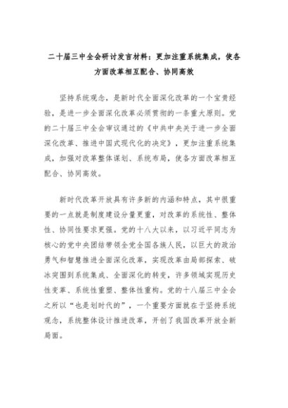 【七哥公文】2024年:二十届三中全会研讨发言材料:更加注重系统集成,使各方面改革相互配合、协同高效+更多免费公文+VX:QiGeGongWen2024