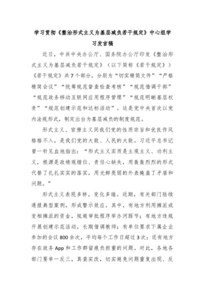 【七哥公文】2024年:学习贯彻《整治形式主义为基层减负若干规定》中心组学习发言稿+更多免费公文+VX:QiGeGongWen2024