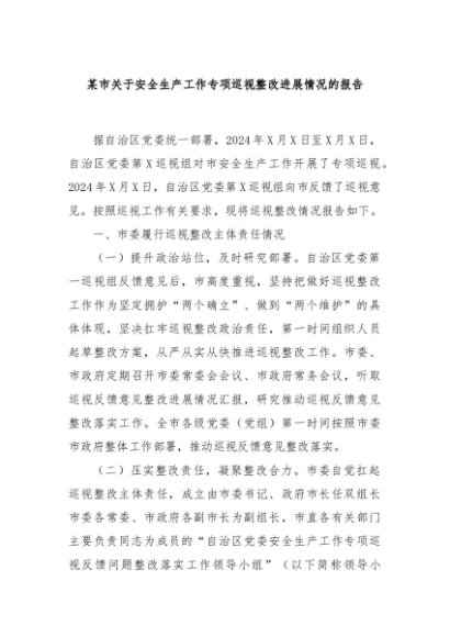 / 【七哥公文】2024年:某市关于安全生产工作专项巡视整改进展情况的报告+更多免费公文+VX:QiGeGongWen2024