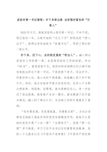 【七哥公文】2024年:派驻村第一书记感悟:扑下身谋出路 当好强村富民的“引路人”+更多免费公文+VX:QiGeGongWen2024