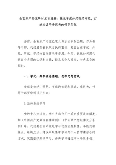 【七哥公文】2024年:全面从严治党研讨发言材料:深化学纪知纪明纪守纪,打造忠诚干净担当的领导队伍+更多免费公文+VX:QiGeGongWen2024