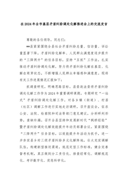 【七哥公文】2024年:在2024年全市基层矛盾纠纷调处化解推进会上的交流发言+更多免费公文+VX:QiGeGongWen2024