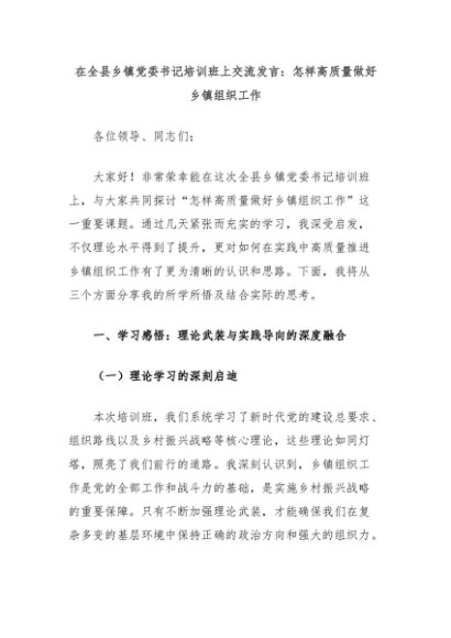 【七哥公文】2024年:在全县乡镇党委书记培训班上交流发言:怎样高质量做好乡镇组织工作+更多免费公文+VX:QiGeGongWen2024