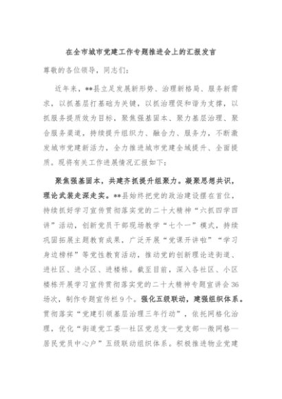 / 【七哥公文】2024年:在全市城市党建工作专题推进会上的汇报发言+更多免费公文+VX:QiGeGongWen2024