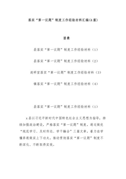 / 【七哥公文】2024年:(4篇)落实“第一议题”制度工作经验材料汇编+更多免费公文+VX:QiGeGongWen2024
