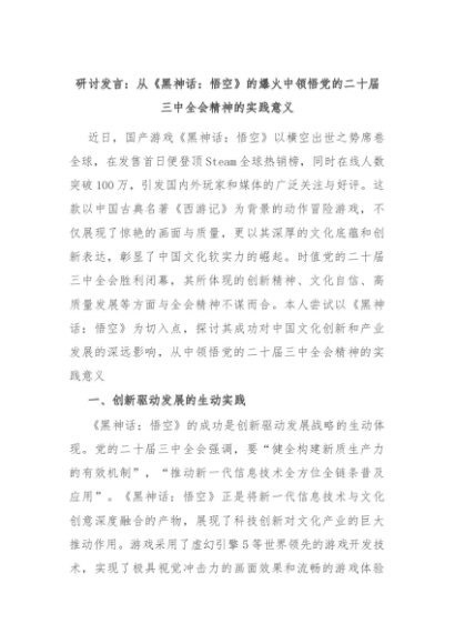 【七哥公文】2024年:研讨发言:从《黑神话:悟空》的爆火中领悟党的二十届三中全会精神的实践意义 (1)+更多免费公文+VX:QiGeGongWen2024