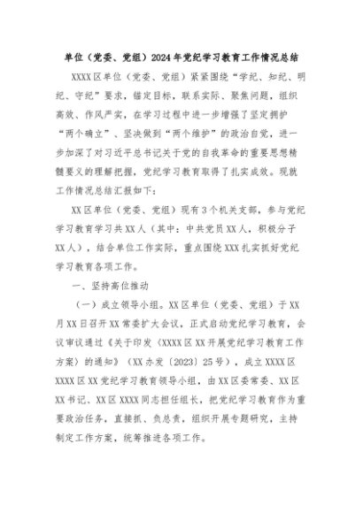 【七哥公文】2024年:单位(党委、党组)2024年党纪学习教育工作情况总结+更多免费公文+VX:QiGeGongWen2024