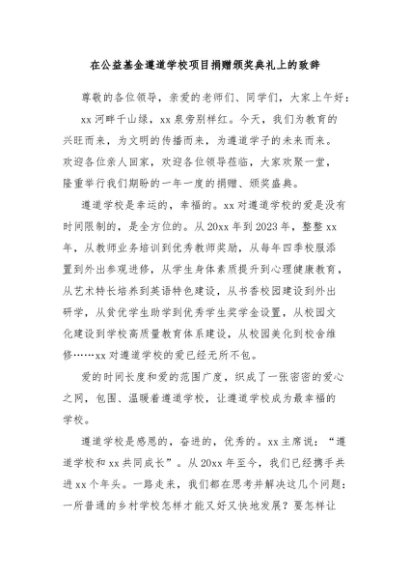 【七哥公文】2024年:在公益基金遵道学校项目捐赠颁奖典礼上的致辞+更多免费公文+VX:QiGeGongWen2024