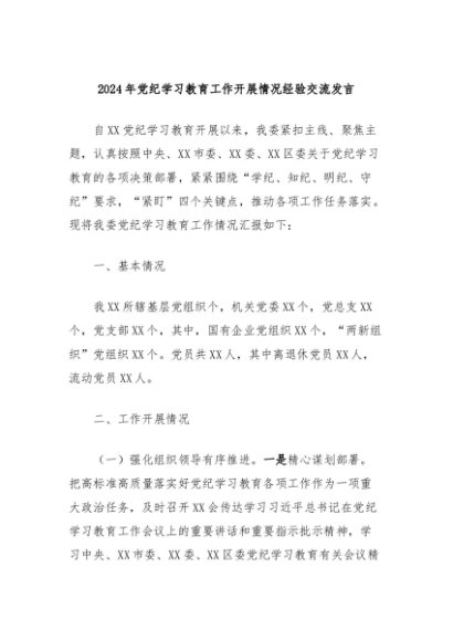 / 【七哥公文】2024年:2024年党纪学习教育工作开展情况经验交流发言+更多免费公文+VX:QiGeGongWen2024