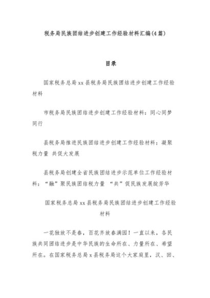 / 【七哥公文】2024年:(4篇)税务局民族团结进步创建工作经验材料汇编+更多免费公文+VX:QiGeGongWen2024