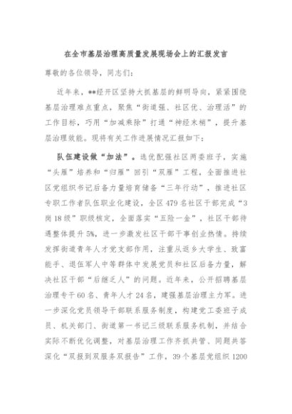 / 【七哥公文】2024年:在全市基层治理高质量发展现场会上的汇报发言+更多免费公文+VX:QiGeGongWen2024
