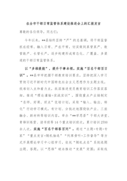/ 【七哥公文】2024年:在全市干部日常监管体系建设推进会上的汇报发言+更多免费公文+VX:QiGeGongWen2024