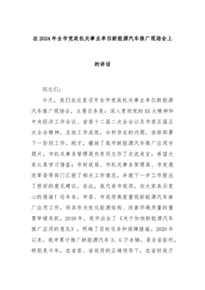 【七哥公文】2024年:在2024年全市党政机关事业单位新能源汽车推广现场会上的讲话+更多免费公文+VX:QiGeGongWen2024