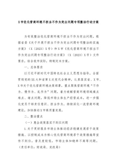 【七哥公文】2024年:X市优化营商环境不担当不作为突出问题专项整治行动方案+更多免费公文+VX:QiGeGongWen2024
