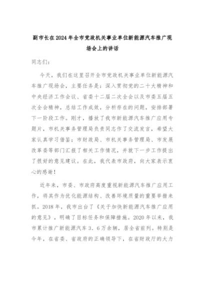 【七哥公文】2024年:副市长在2024年全市党政机关事业单位新能源汽车推广现场会上的讲话+更多免费公文+VX:QiGeGongWen2024