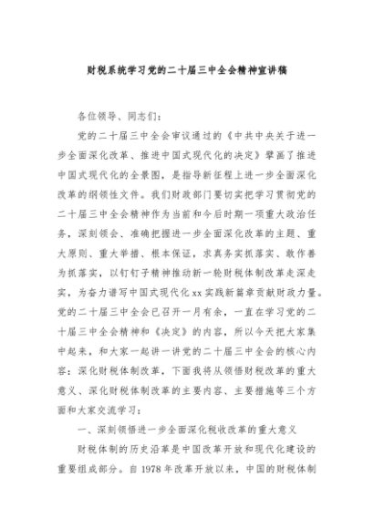 【七哥公文】2024年:财税系统学习党的二十届三中全会精神宣讲稿,更多免费公文资料,+VX:QiGeGongWen2024+更多免费公文+VX:QiGeGongWen2024