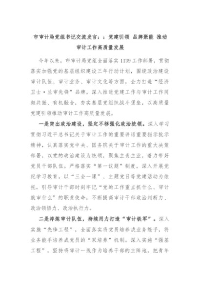 【七哥公文】2024年:市审计局党组书记交流发言::党建引领 品牌聚能 推动审计工作高质量发展+更多免费公文+VX:QiGeGongWen2024