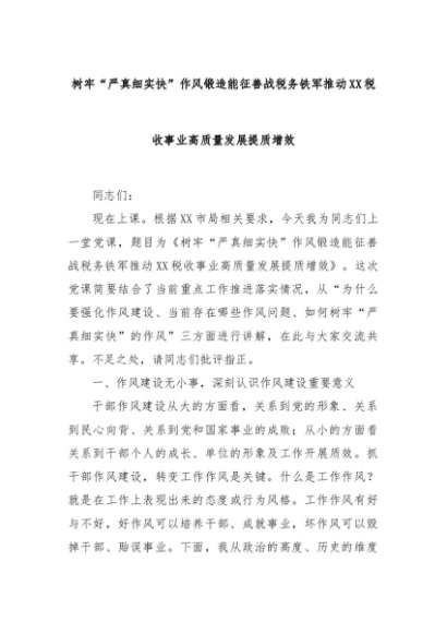 【七哥公文】2024年:树牢“严真细实快”作风锻造能征善战税务铁军推动XX税收事业高质量发展提质增效+更多免费公文+VX:QiGeGongWen2024
