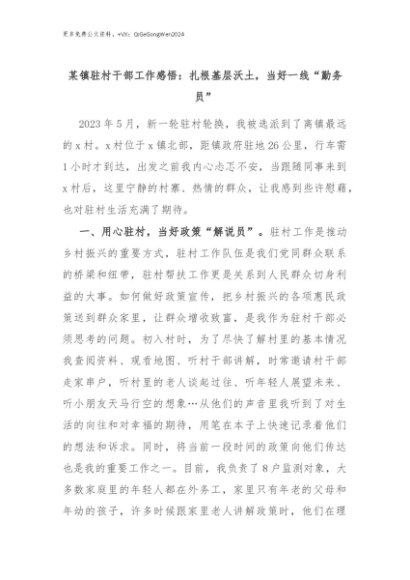 【七哥公文】2024年:某镇驻村干部工作感悟:扎根基层沃土,当好一线“勤务员”+更多免费公文+VX:QiGeGongWen2024