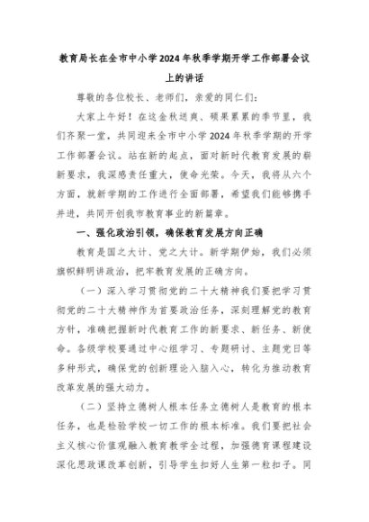 【七哥公文】2024年:教育局长在全市中小学2024年秋季学期开学工作部署会议上的讲话,更多免费公文资料,+VX:QiGeGongWen2024+更多免费公文+VX:QiGeGongWen2024