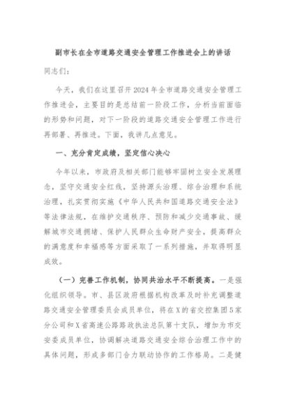 【七哥公文】2024年:副市长在全市道路交通安全管理工作推进会上的讲话,更多免费公文资料,+VX:QiGeGongWen2024+更多免费公文+VX:QiGeGongWen2024