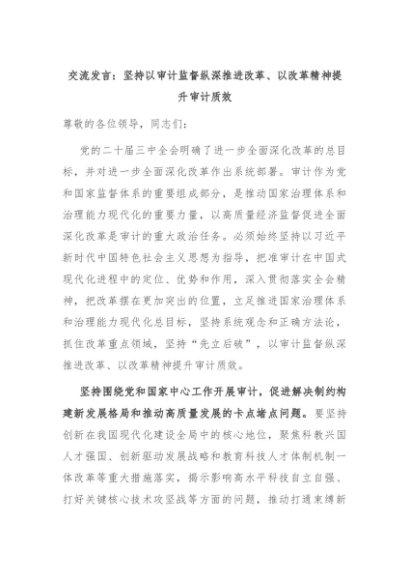 【七哥公文】2024年:交流发言:坚持以审计监督纵深推进改革、以改革精神提升审计质效,更多免费公文资料,+VX:QiGeGongWen2024+更多免费公文+VX:QiGeGongWen2024