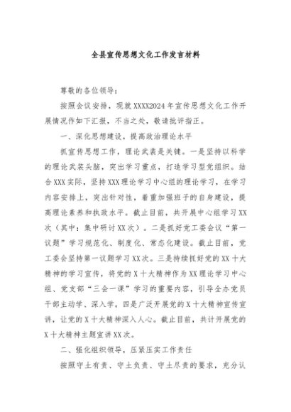 / 【七哥公文】2024年:全县宣传思想文化工作发言材料+更多免费公文+VX:QiGeGongWen2024