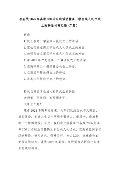 【七哥公文】2024年:在备战2025年高考300天启航活动暨高三学生成人礼仪式上的讲话材料汇编(7篇),更多免费公文资料,+VX:QiGeGongWen2024 (2)+更多免费公文+VX:QiGeGongWen2024