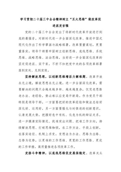 【七哥公文】2024年:学习贯彻二十届三中全会精神树立“五大思维”做改革促进派发言稿+更多免费公文+VX:QiGeGongWen2024