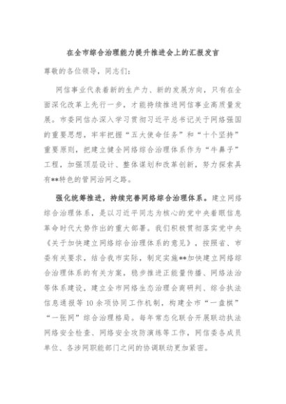 / 【七哥公文】2024年:在全市综合治理能力提升推进会上的汇报发言+更多免费公文+VX:QiGeGongWen2024