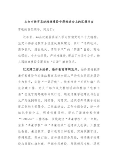 / 【七哥公文】2024年:在全市教育系统清廉建设专题推进会上的汇报发言+更多免费公文+VX:QiGeGongWen2024