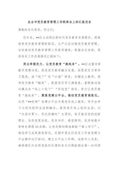 / 【七哥公文】2024年:在全市党员教育管理工作联席会上的汇报发言+更多免费公文+VX:QiGeGongWen2024