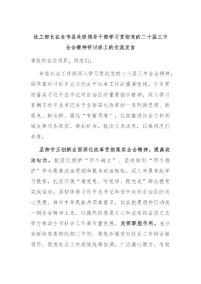 【七哥公文】2024年:社工部长在全市县处级领导干部学习贯彻党的二十届三中全会精神研讨班上的交流发言+更多免费公文+VX:QiGeGongWen2024