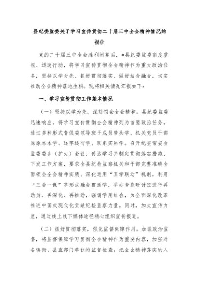 【七哥公文】2024年:县纪委监委关于学习宣传贯彻二十届三中全会精神情况的报告+更多免费公文+VX:QiGeGongWen2024