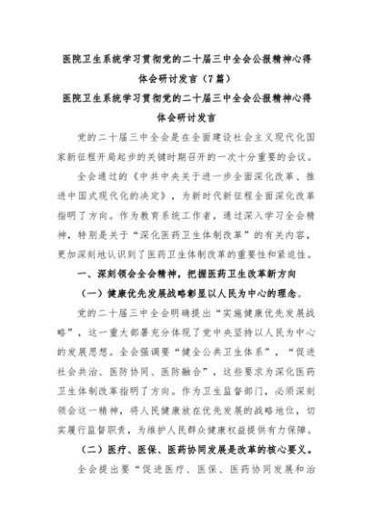 【七哥公文】2024年:(7篇)医院卫生系统学习贯彻党的二十届三中全会公报精神心得体会研讨发言+更多免费公文+VX:QiGeGongWen2024