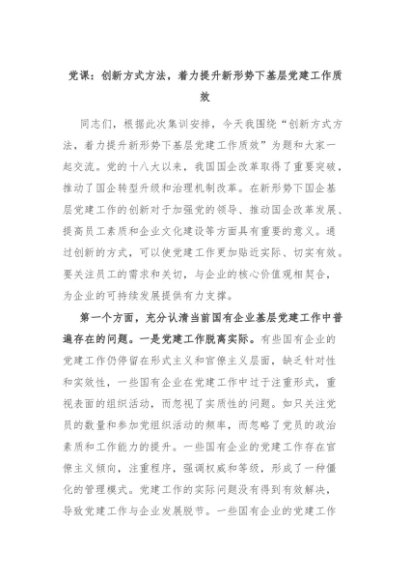 【七哥公文】2024年:党课:创新方式方法,着力提升新形势下基层党建工作质效+更多免费公文+VX:QiGeGongWen2024