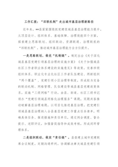 / 【七哥公文】2024年:工作汇报:“四联机制”走出城市基层治理新路径+更多免费公文+VX:QiGeGongWen2024
