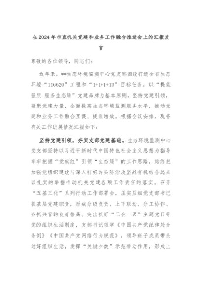 【七哥公文】2024年:在2024年市直机关党建和业务工作融合推进会上的汇报发言+更多免费公文+VX:QiGeGongWen2024