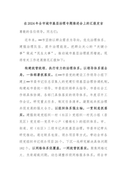 【七哥公文】2024年:在2024年全市城市基层治理专题推进会上的汇报发言+更多免费公文+VX:QiGeGongWen2024