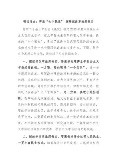 / 【七哥公文】2024年:研讨发言:突出“七个聚焦” 继续把改革推深做实+更多免费公文+VX:QiGeGongWen2024
