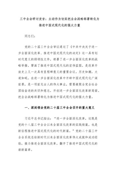 【七哥公文】2024年:三中全会研讨发言:主动作为切实把全会战略部署转化为推进中国式现代化的强大力量+更多免费公文+VX:QiGeGongWen2024