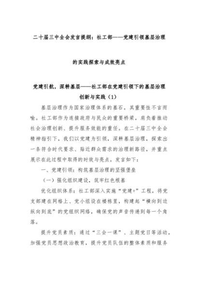 【七哥公文】2024年:二十届三中全会发言提纲:社工部——党建引领基层治理的实践探索与成效亮点+更多免费公文+VX:QiGeGongWen2024