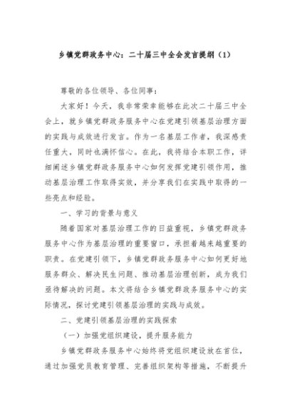 / 【七哥公文】2024年:乡镇党群政务中心:二十届三中全会发言提纲(1)+更多免费公文+VX:QiGeGongWen2024