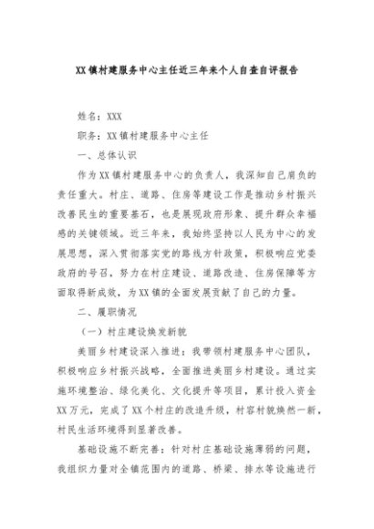 【七哥公文】2024年:XX镇村建服务中心主任近三年来个人自查自评报告+更多免费公文+VX:QiGeGongWen2024