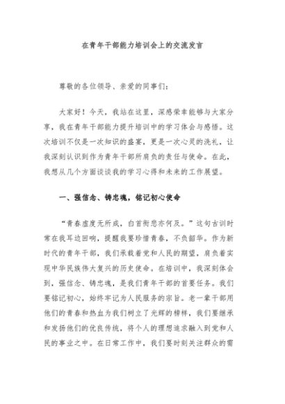 / 【七哥公文】2024年:在青年干部能力培训会上的交流发言+更多免费公文+VX:QiGeGongWen2024