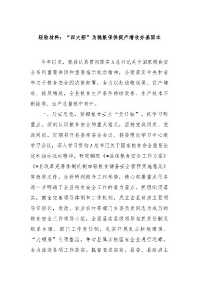 / 【七哥公文】2024年:经验材料:“四大招”为稳粮保供促产增收夯基固本+更多免费公文+VX:QiGeGongWen2024