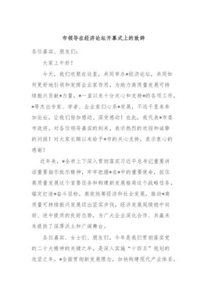 【七哥公文】2024年:市领导在经济论坛开幕式上的致辞+更多免费公文+VX:QiGeGongWen2024