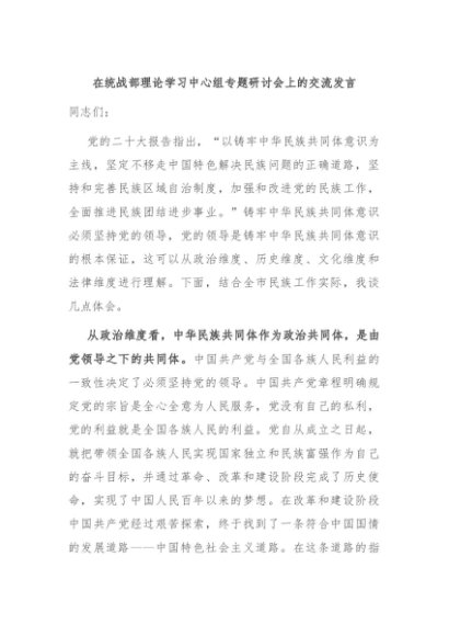 / 【七哥公文】2024年:在统战部理论学习中心组专题研讨会上的交流发言+更多免费公文+VX:QiGeGongWen2024