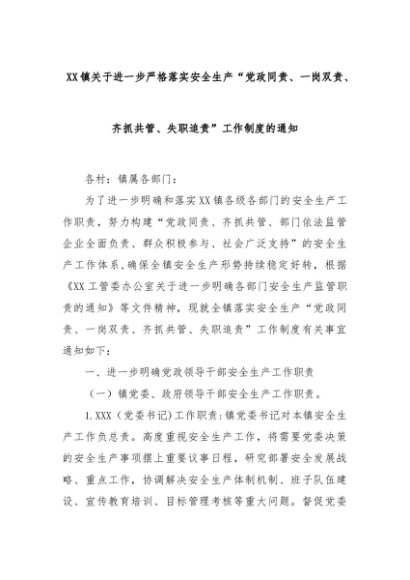 【七哥公文】2024年:XX镇关于进一步严格落实安全生产“党政同责、一岗双责、齐抓共管、失职追责”工作制度的通知+更多免费公文+VX:QiGeGongWen2024